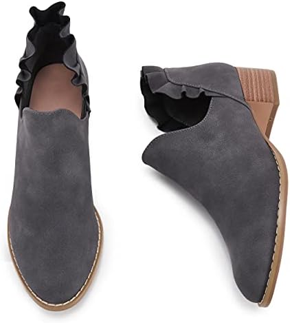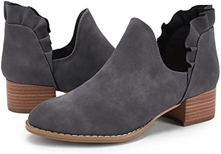 FISACE Womens Ruffled Ankle Boots V Cut Out Pointed Toe Chunky Low Heel Dressy Western Booties